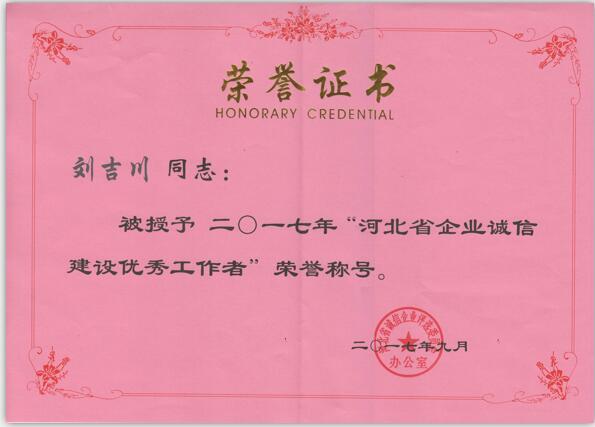 公司總經理劉吉川先生被授予2017年“河北省企業誠信建設優秀工作者”榮譽稱號!