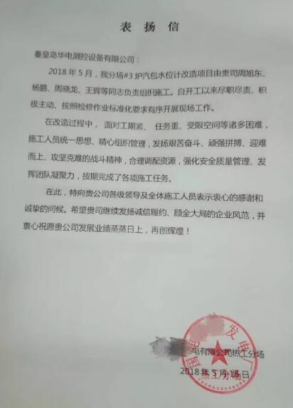 2018年5月18日,公司再次收到來自國電某發電廠的一封表揚信。信中,甲方對公司全體施工人員盡職盡責、積極主動、規范有序的態度和精神提出嘉許。信中提到:“在改造過程中,面對工期緊、任務重、受限空間等諸多因素,施工人員統一思想、精心組織管理,發揚艱苦奮斗、頑強拼搏、迎難而上、攻堅克難的戰斗精神,合理調配資源,強化安全質量管理、發揮團隊凝聚力,按期完成了各項施工任務。”