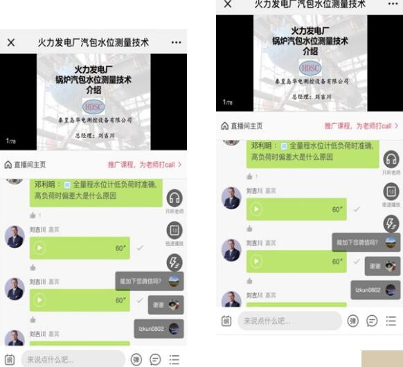 直播課程通過語音與PPT相結合,向大家詳細的講解了汽包水位測量系統技術規程的必要性、汽包水位測量系統改造必要性、汽包水位測量系統的問題及技術難點、如何解決、改造效果。為大家分享經驗,直播最后20分鐘劉吉川總經理現場為熱控技術人員進行答疑解惑,解決了他們心中的疑慮,得到了技術人員的積極響應和高度評價。