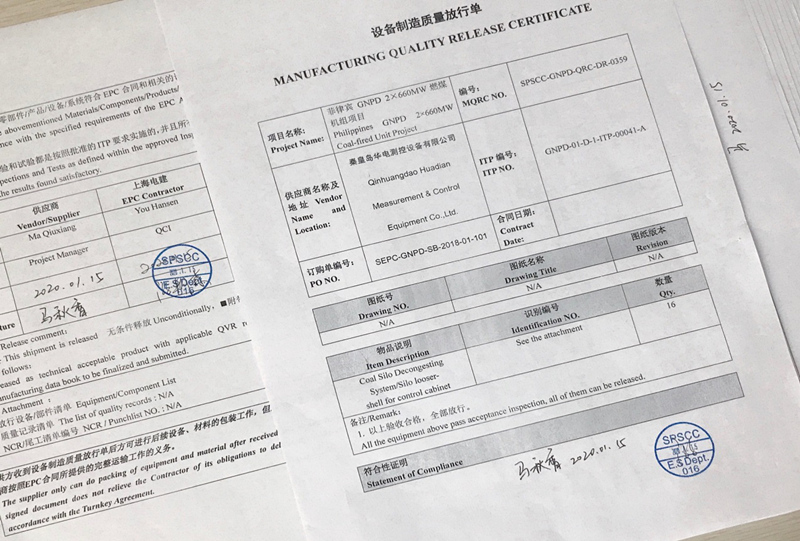 1月16日,華電測控供菲律賓GNPower Dinginin 2×660MW燃煤電廠14臺控制柜出廠發(fā)貨。設(shè)備出廠前經(jīng)過上海電建設(shè)備監(jiān)造部的現(xiàn)場檢驗,驗收合格予以放行出廠。這是繼2018年6月供GNPD項目1號機(jī)組7套煤倉疏松機(jī)設(shè)備、2019年3月供GNPD項目2號機(jī)組7套煤倉疏松機(jī)設(shè)備的第三批次供貨。