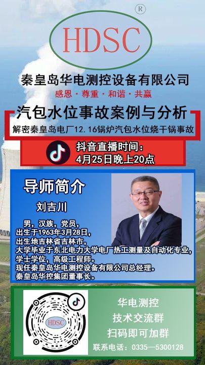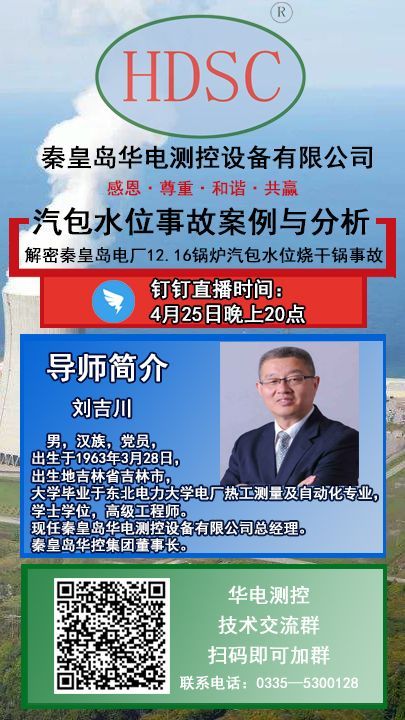 2020425日晚8時,秦皇島華控集團有限公司董事長劉吉川先生攜手【熱控圈】舉辦“火力發電廠鍋爐汽包水位測量系統系列講座之解密秦皇島電廠12.16鍋爐汽包燒干鍋事故”。“千聊”、“抖音”、“釘釘”軟件同步直播。