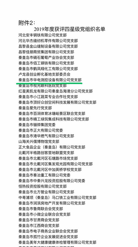 2005年5月,經中共秦皇島海港區委組織部批準,中共秦皇島華電測控設備有限公司支部委員會正式成立。迄今華電測控黨支部成立15年,一直被上級街道黨工委認可為黨組共建的先進單位。