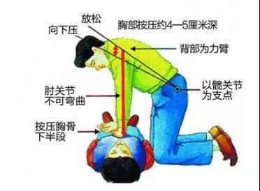 4.心肺復蘇:兩只手掌根重疊置于傷者胸骨中下1/3處,男性在兩乳頭連線中點。肘關節伸直,借助身體之重力向傷者脊柱方向按壓。按壓頻率100――120次/分。單人搶救時,每按壓30次,俯下做口對口人工呼吸2次(30:2)。雙人CPR時可采用15:2的比率。