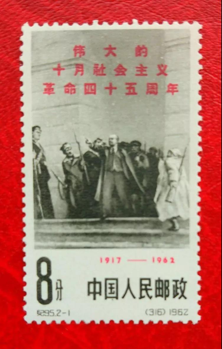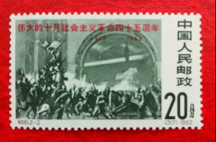 郵票記載歷史,郵票也在講故事。后來,郵電部又在1962年11月7日發行了紀95《偉大的十月社會主義革命45周年》的紀念郵票,全套2枚。2-1為"列寧和衛兵" 。畫面中間為列寧。2-2為"攻打冬宮"。畫面再現了1917年11月7日,在列寧領導下,彼得格勒工人和士兵舉行武裝起義,并向俄國臨時政府所在地--冬宮發起總攻,臨時政府最終滅亡。