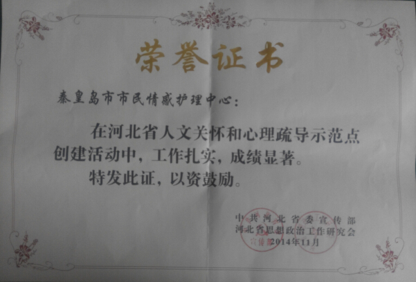 2014年11月,秦皇島市市民情感護理中心在河北省人文關懷和心理疏導示范點創(chuàng)建活動中,工作扎實,成績顯著,喜獲中共河北省委宣傳部、河北省思想政治工作研究會頒發(fā)的榮譽證書。