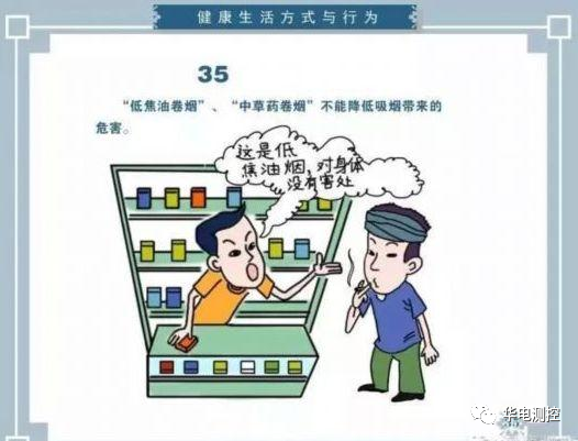 提高人們的健康素養(yǎng),一方面要認(rèn)識吸煙及二手煙的危害相當(dāng)重要,同時還提示人們認(rèn)真研讀《中國公民健康素養(yǎng)—基本知識與技能》第二部分,關(guān)于“健康生活方式與行為”,包括第三十五條:“低焦油卷煙”、“中草藥卷煙”不能降低吸煙帶來的危害。
