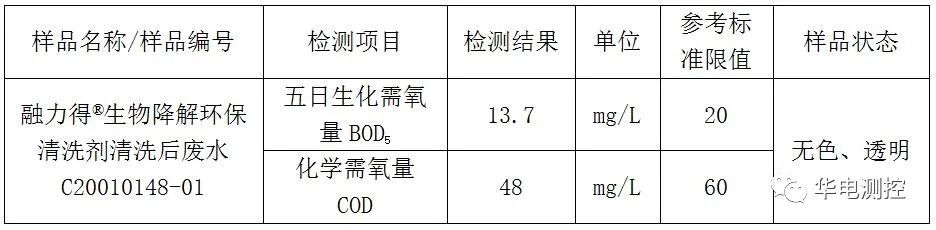 融力得®生物降解環保清洗劑經英格爾檢測技術服務(上海)有限公司檢驗,生化需氧量為13.7 mg/L,遠遠高于中國國家環保標準要求,可以通過工廠現有污水處理系統進行排放。