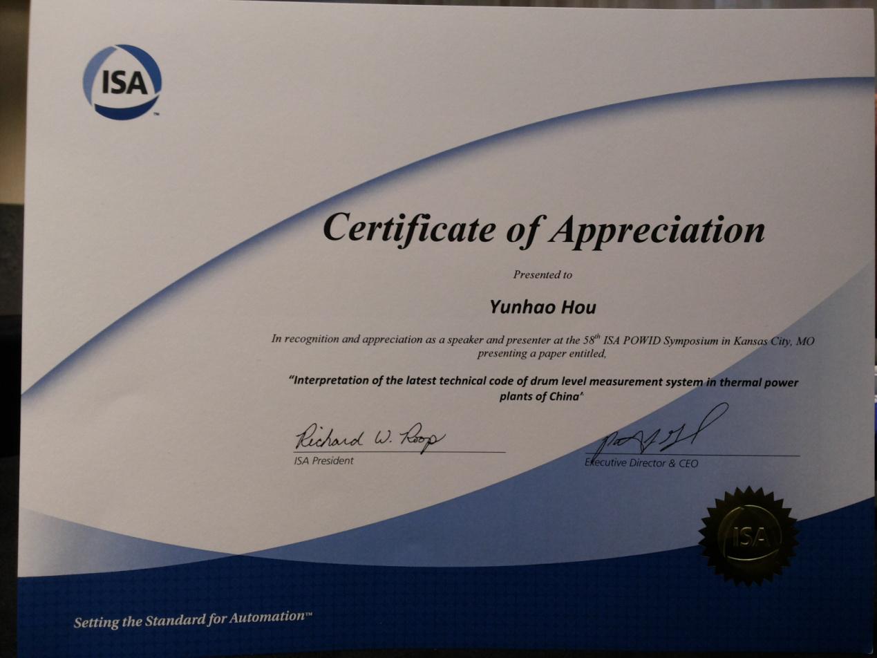 這次是我公司第三次受邀參會,國貿部副經理、高級工程師于勝利和副總工程師崔明思代表公司參會。新的汽包水位測量技術行業標準得到了與會專家的高度重視和認可,公司在汽包水位測量技術領域取得的成就得到了美國標準管理局ISA和電力行業專家的肯定和贊譽。華電測控對世界電力行業做出了突出的貢獻,在標準層面引領世界電力行業向更安全,更可靠發展。