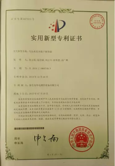 公司于2014年12月24日提交的“汽包水位內裝平衡容器”專利獲中華人民共和國國家知識產權局頒發專利證書。