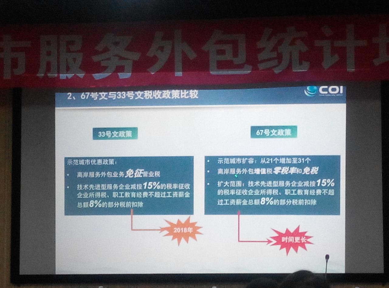 通過本次培訓(xùn)清晰了什么是服務(wù)外包;服務(wù)外包的分類:2014年現(xiàn)行統(tǒng)計(jì)標(biāo)準(zhǔn)分為三個(gè)門類(ITO信息技術(shù)外包、BPO業(yè)務(wù)流程外包、KPO知識(shí)流程外包),九個(gè)大類(軟件研發(fā)外包、信息技術(shù)服務(wù)外包、運(yùn)營(yíng)和維護(hù)服務(wù)、內(nèi)部管理外包服務(wù)、業(yè)務(wù)運(yùn)營(yíng)外包服務(wù)、供應(yīng)鏈外包服務(wù)、商務(wù)服務(wù)外包、技術(shù)服務(wù)外包、研發(fā)服務(wù)外包),35個(gè)中類;服務(wù)外包與服務(wù)貿(mào)易之間的關(guān)系等。服務(wù)外包產(chǎn)業(yè)的發(fā)展在國家政策《國務(wù)院關(guān)于促進(jìn)服務(wù)外包產(chǎn)業(yè)加快發(fā)展的意見》國發(fā)[2014]67號(hào)文件(離岸服務(wù)外包增值稅零稅率和免稅,擴(kuò)大范圍:技術(shù)先進(jìn)型服務(wù)企業(yè)減按15%的稅率征收企業(yè)所得稅,職工教育經(jīng)費(fèi)不超過工資薪金總額8%的部分稅前扣除)的支持力度下,不斷成長(zhǎng)提升。通過建立的有效溝通和營(yíng)銷渠道,構(gòu)建交易平臺(tái),積極走出去,尋求與國際接軌的走向國際的策略,借助云計(jì)算、大數(shù)據(jù)等新技術(shù)融合共同發(fā)展。最后,主辦方秦皇島市商務(wù)局代表做了總結(jié)發(fā)言,還為大家精心準(zhǔn)備了冷餐,就餐的同時(shí)大家相互交流,彼此相互了解。