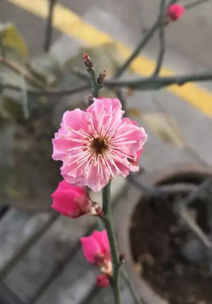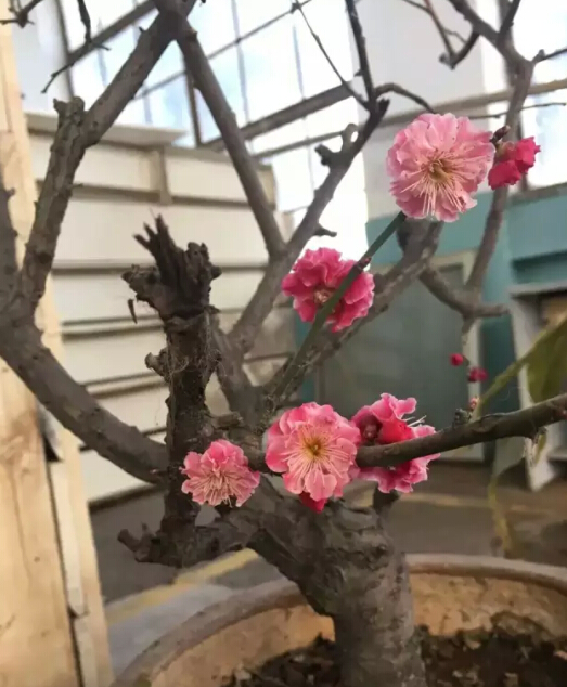 也許是工作的繁忙讓我經常忽略周圍的環境變化,今天不經意的一瞥,竟然發現了幾朵嬌艷的粉色!!!那是保潔姐放在車間一盆不起眼的“干樹杈”,我走近一看,竟然冒出了好幾朵粉嫩的花,有的含苞待放、有的正在盛開,湊近一聞一股黯然凜冽的幽香撲鼻而來,沁人心脾。