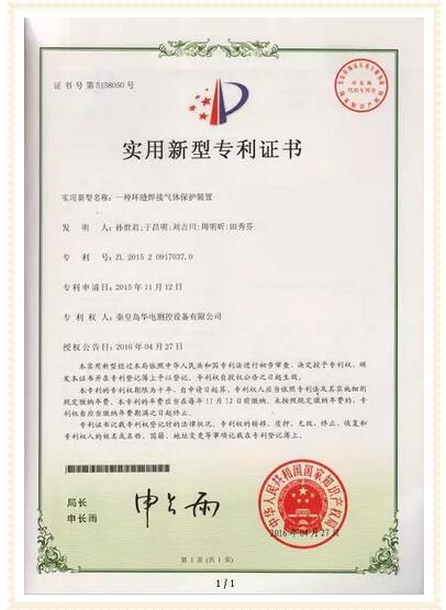 【企業(yè)要聞】公司申請(qǐng)的“一種環(huán)縫焊接氣體保護(hù)裝置”獲頒實(shí)用新型專利證書