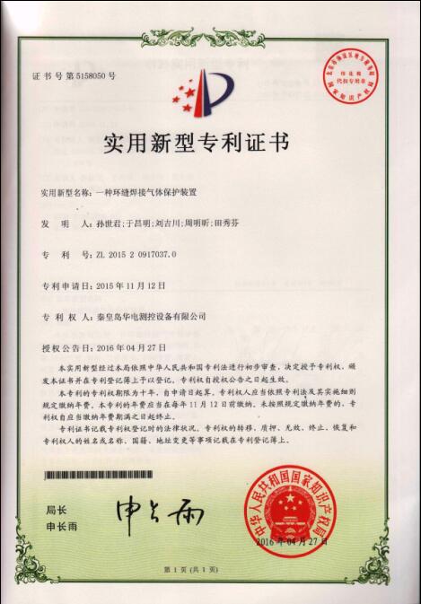 在此項目研發過程中,由于昌明和孫世君共同研發的“一種環縫焊接氣體保護裝置”已被中華人民共和國國家知識產權局頒發實用新型專利證書。
