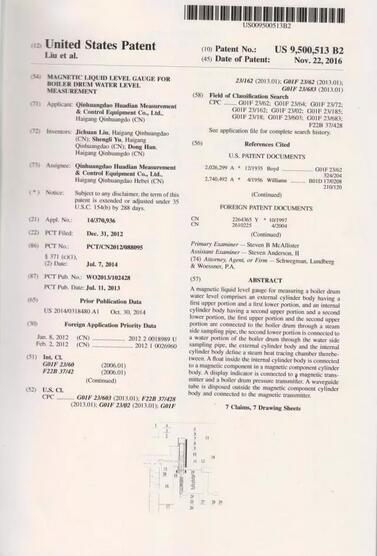 好消息:公司于2014年7月向美國提交的“汽包水位磁致液位計”發明專利申請,經過Director of the United States Patent and Trademark Office嚴謹認真的審查,已經于2016年11月22授予了發明專利權,頒發了美國發明專利證書,專利號為:U.S.Patent No.9500513 B2。