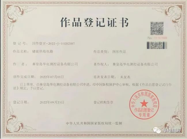 熱烈祝賀華電測控知識產權再添一員” 2022-10-262022年9月26日,秦皇島華電測控設備有限公司收到中華人民共和國國家版權局頒發的《儲能供電電路——作品登記證書》。